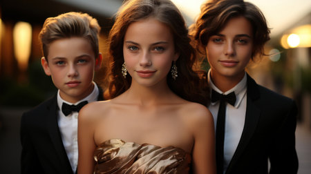 Portrait of handsome famous teenagers actors in elegant evening dresses at cinema award.