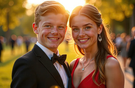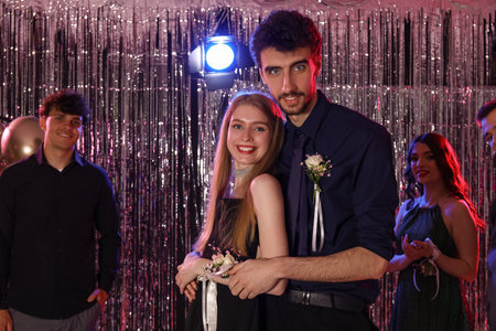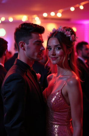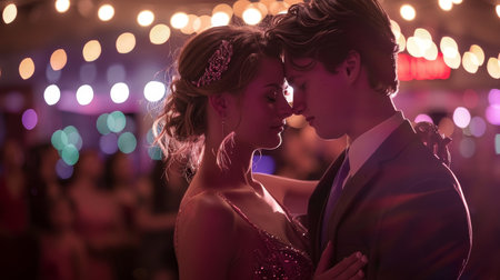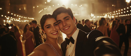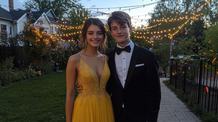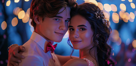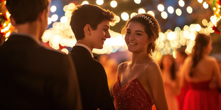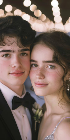 Young couple dressed up for prom night, standing close together under the soft glow of string lights, creating a romantic and celebratory atmosphere as they enjoy the special occasion