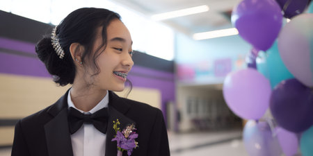 Young asian teenager smiling and looking away, dressed in a tuxedo with a boutonni