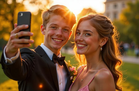 Teenagers taking selfies in formal wear during prom in city park, smiles on faces, prom. High quality photo