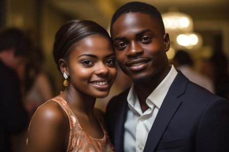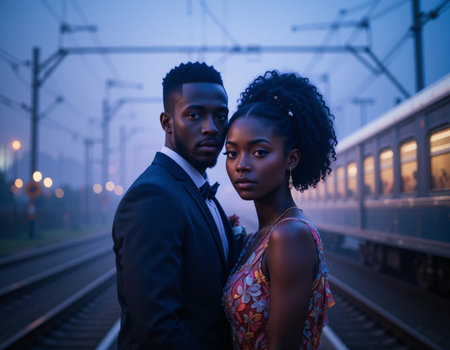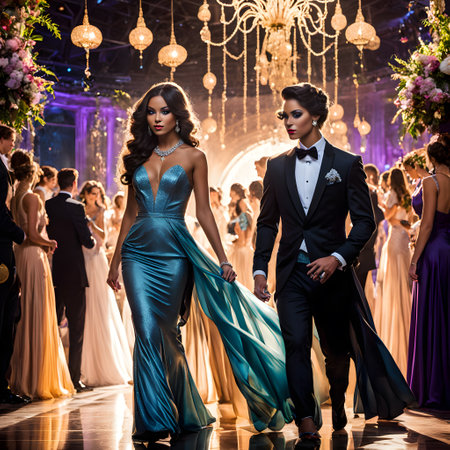 Elegant couple exuding luxury and style in a glamorous setting, captured against a dark backdrop.