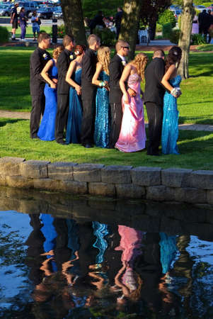Plainville, CT USA. June 2013. A nice water reflection of the high school Class of 2013 in formal prom attire posing for the photographer.
