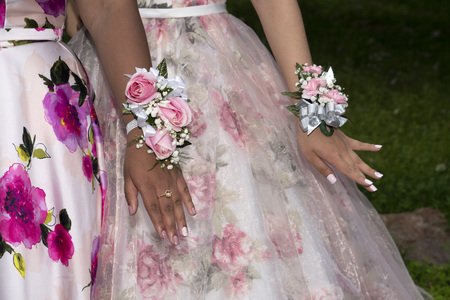 Picture of lovely adolescent buddies in prom gowns in a parking lot