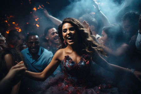 A woman dressed in a shimmering gown stands confidently at a vibrant celebration. Surrounded by guests, the event is filled with lights, music, and joy, highlighting the festive ambiance.