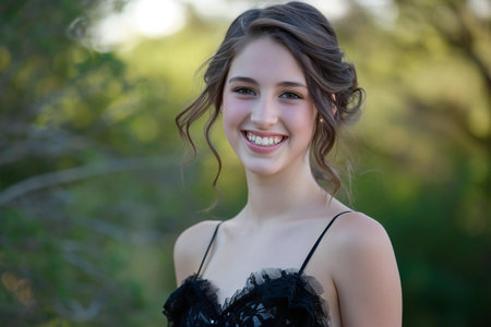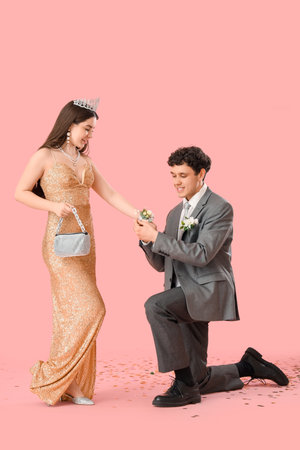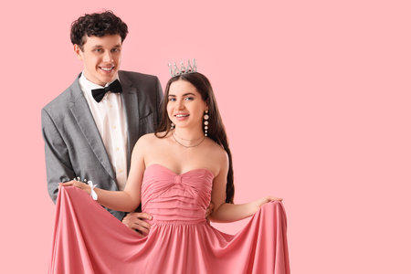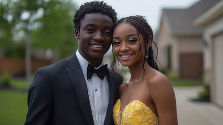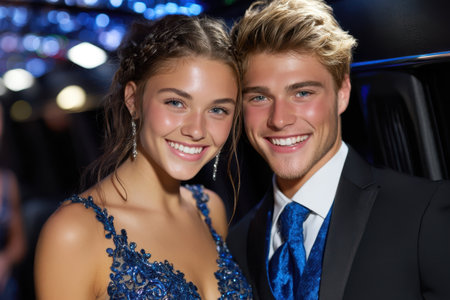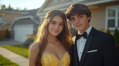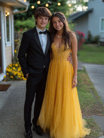 a pretty teen in a beautiful prom dress with her date at her side, created with generative ai