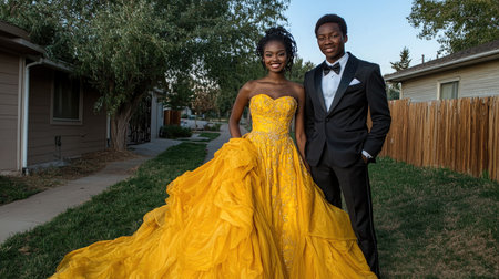 A Black couple in an outdoor garden wearing a flowing yellow prom dress with a sweetheart neckline, delicate lace embroidery, and tulle layers, radiating warmth and sophistication