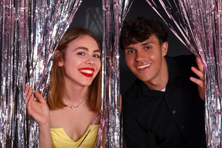 Group of cheerful elegant friends posing together for a photo at nightclub party with disco lights and gold tinsel curtain backdrop
