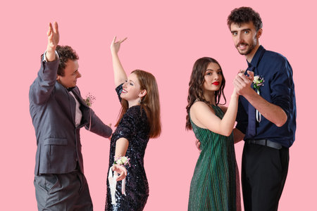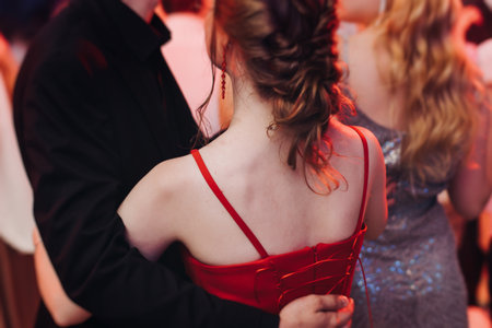 High school graduates dancing on prom, waltz and classical ball slow dance in dresses and suits on school graduation party, boys and girls ballroom dancers, couples dance quadrille, polonaise