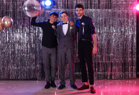 Happy students wearing beautiful dresses and tuxedos making photo before college prom graduation party.AI Generative.