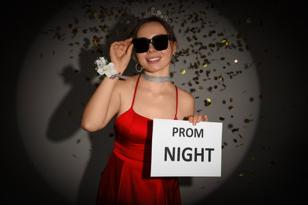 Beautiful young woman in tiara holding paper with text PROM NIGHT on dark background