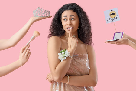 Beautiful young thoughtful African-American woman in stylish shiny dress and hands holding things for prom on pink background