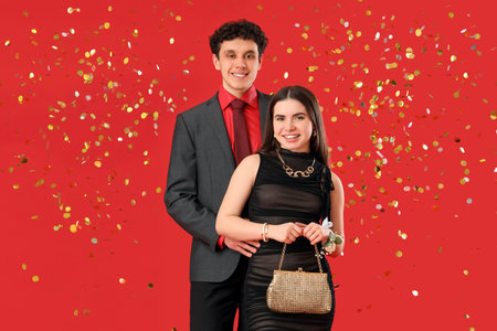 Group of beautiful people in formalwear dancing and smiling while confetti flying all around : Generative AI