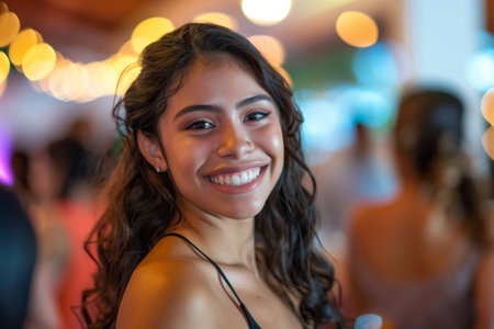 Close-up of a joyful young woman with a bright smile at a festive event, with blurred lights background