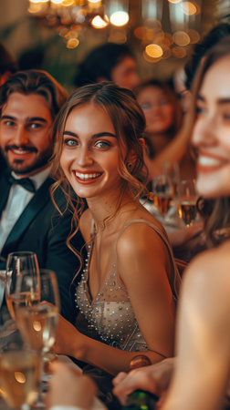 Group of charming party makers celebrating joyfully at a stylish event in an elegant venue during evening hours with vibrant expressions and fashionably chic attire
