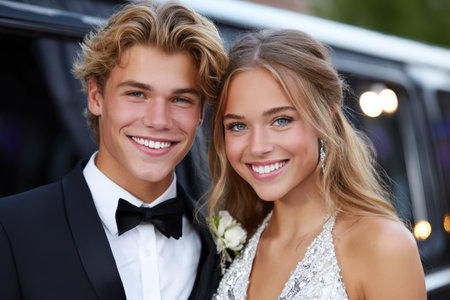 Two young adults dressed in formal attire pose happily together outside a limousine during an evening event.
