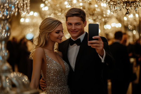 A couple dressed in formal attire captures a selfie at a luxurious event filled with dazzling lights.