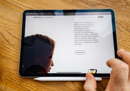 Paris, France - Mar 27, 2019: Man POV at iPad Pro tablet reading on Apple.com website about new Apple Card - a new level of privacy and security with FaceId and TouchID