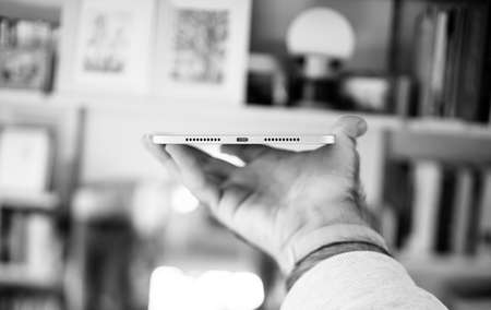 POV male hand holding thin Apple Computers new iPad Mini 6th tablet with Apple pencil