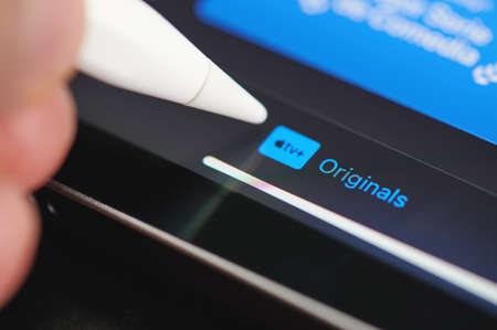 New york, USA - September 24 2021: Apple tv plus original on ipad panel screen close up view using pen