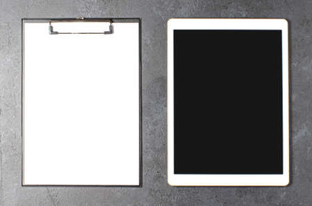 Modern dark surface office desk table with computer, Tablet with blank screen and cup of coffee. Hero Header Concept.