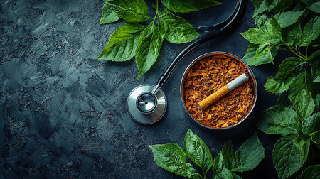 A health-conscious flat lay showing a cigarette in a bowl of tobacco, a stethoscope, and green leaves.
