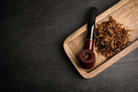 Tray with smoking pipe and dry tobacco on black table, top view. Space for text