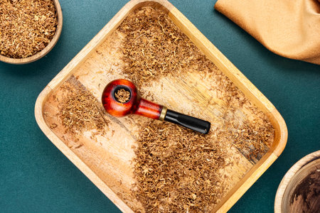 Pipe tobacco on a wooden background. Close-up. Selective focus.