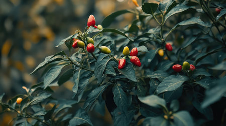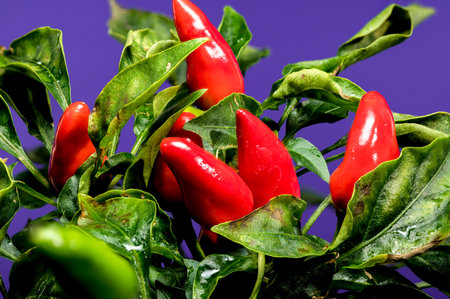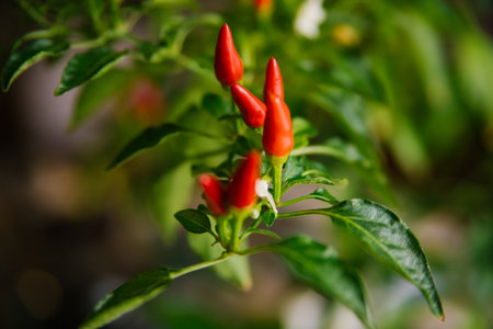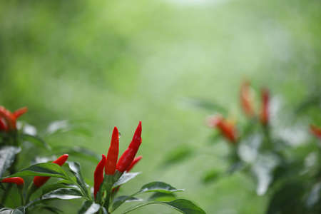 Red hot chili peppers growing on a farm in the countryside of Brazil.