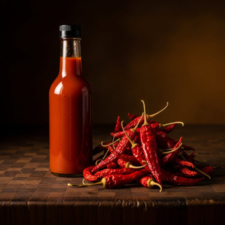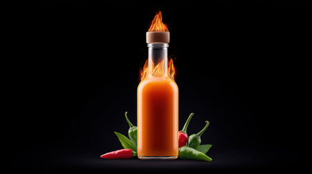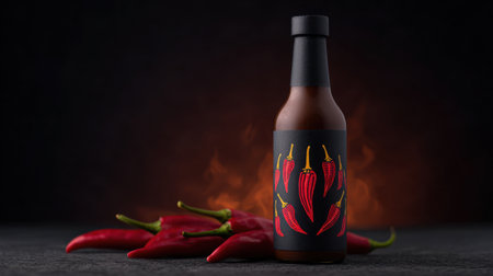 A visually striking bottle of spicy chili sauce featuring vibrant red chili peppers. The dark setting and hints of flame create a dramatic backdrop perfect for culinary photography.