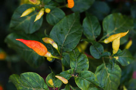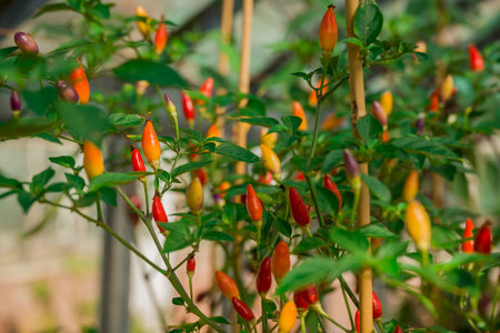 Red and yellow hot chili peppers on a plant in a greenhouse.