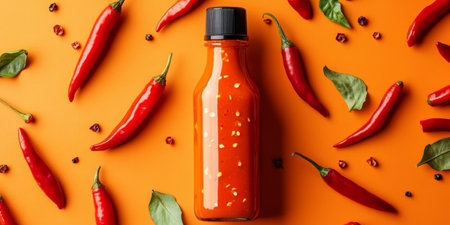 Vibrant hot sauce bottle surrounded by fresh red chilies and green leaves against orange backdrop