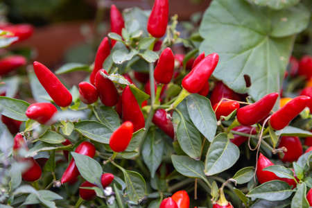 Hot red small pepper. Homemade houseplant. Ripe pepper on a branch with leaves.