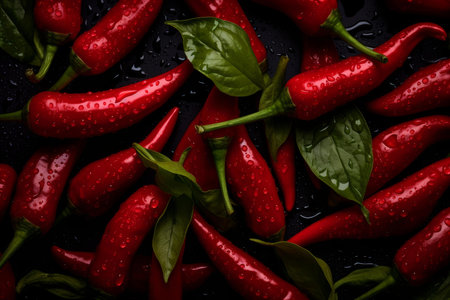 Peppers, cherry peppers, spicy and hot, overhead flat lay, top view on black, AI generative