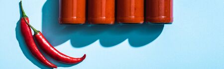 Top view of bottles with chili sauce and chili peppers on blue background, panoramic shot