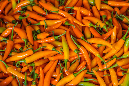 Pile of fresh yellow chilli peppers texture background. Close up. Traditional vegetable market in Bangkok, Thailand.