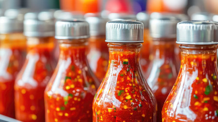 This captivating image showcases a collection of vibrant glass bottles filled with spicy red sauce, perfect for enhancing any meal or culinary creation.
