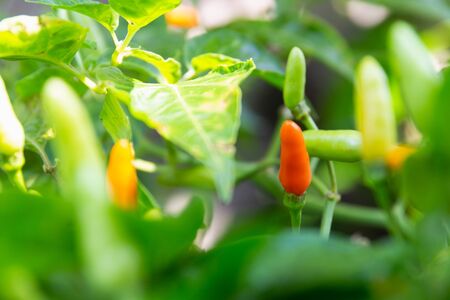 Close up view of a green chilli plant in a garden. Fresh green chillis (Pepper) background.