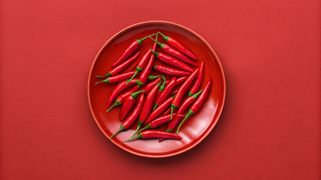 AI Generated. A vibrant flat lay perspective of a single hot red chili pepper on a bright orange background It serves as a food themed design banner with ample copy space image