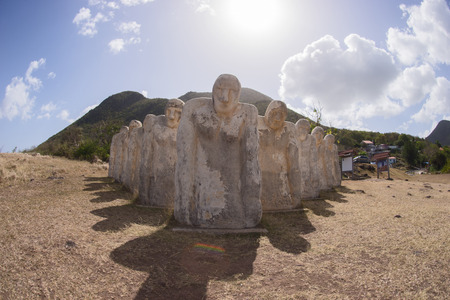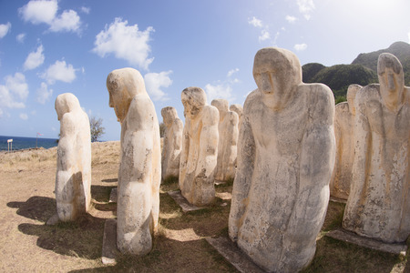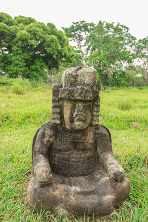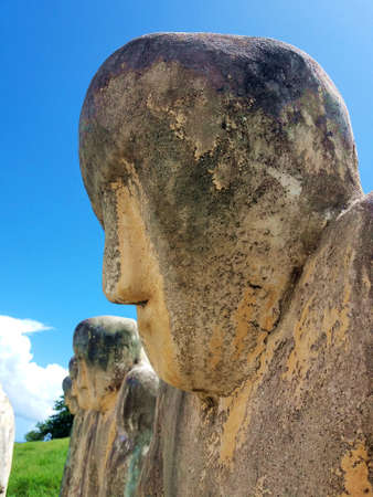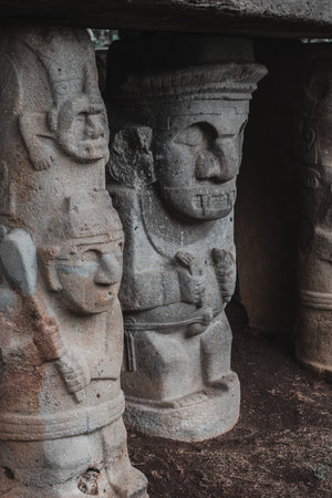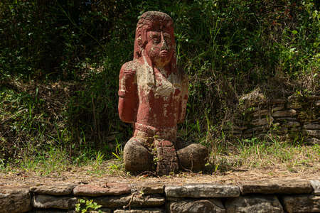 FACATATIVA, COLOMBIA - JANUARY, 2029: Giant stone reproduction of the anthropomorphic objects elaborated by the Muisca culture in the Piedras del Tunjo Archaeological Park in the municipality of Facatativa