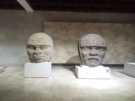 XALAPA, VERACRUZ, MEXICO- FEBRUARY 20, 2020: Traditional Olmeca heads from Tabasco, Veracruz, Mexico at Museo de Antropologia de Xalapa at Xalapa, Veracruz, Mexico