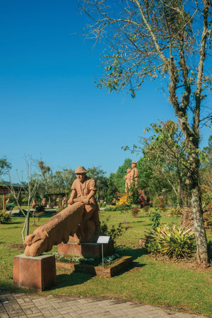 Nova Petropolis, Brazil - July 20, 2019. Sandstone sculpture of a woodworker in a garden at the Sculpture Park Stones of Silence near Nova Petropolis. A lovely rural town founded by German immigrants.