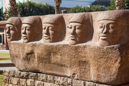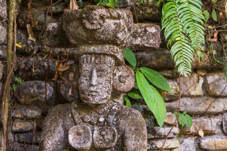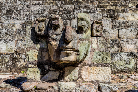 Copan Ruins, Honduras. February 2018. A view of some of the head carvings at the UNESCO world heritage site at Copan Ruins in Honduras.