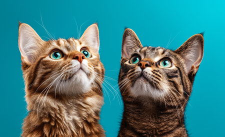 A Happy cats looking up with bright eyes against blue background, showcasing their playful and curious nature