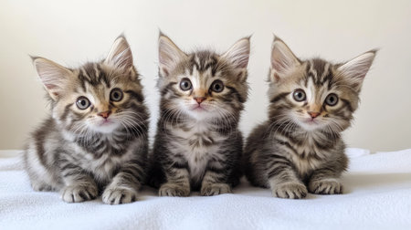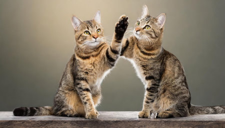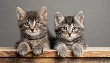 Two cats are featured in this image, sitting side by side against a neutral backdrop. The cats showcase detailed tabby fur patterns with shades of brown and gray. The lighting appears soft, illuminating the subjects. This photograph could be useful for various commercial projects related to animal themes.