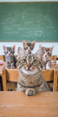 Cat teacher sitting at a desk with its paws folded, looking at the camera, while three cute tabby kittens sit behind on desks in a blurred classroom with a green chalkboard