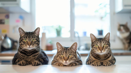 Three tabby cats are sitting on a white countertop in a kitchen, staring intently at the camera. They have their paws resting in front of them, and their bodies are aligned in a row. The countertop is clean and uncluttered, and the kitchen behind them is bright and airy.