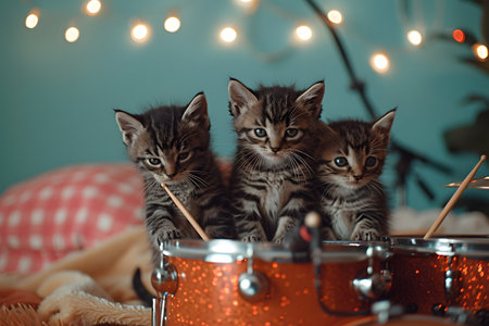 Adorable Trio of Kittens Playing on a Red Drum Set Decorated with Lights