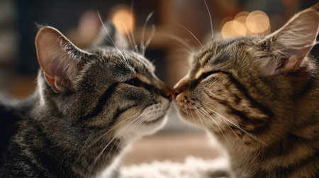 Two tabby cats nuzzling tenderly with soft focus and warm lighting.