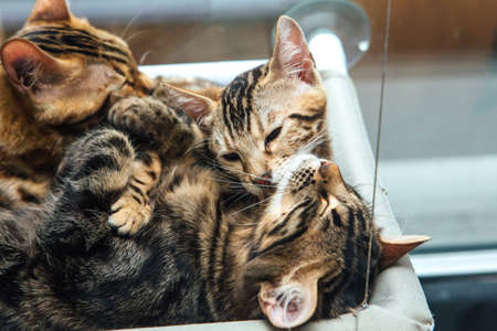 Three cute bengal kittens gold and chorocoal color laying on the cat's window bed licking and washing each other. Sunny seat for cat on the window.