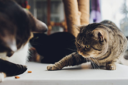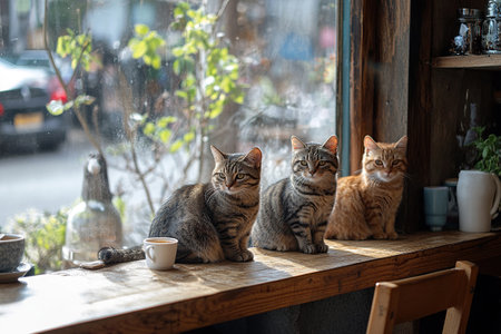 Cats sitting on a wooden bar counter of a street cafe. Funny scene with cats. Cats sitting on the bar counter in a cafe for animals